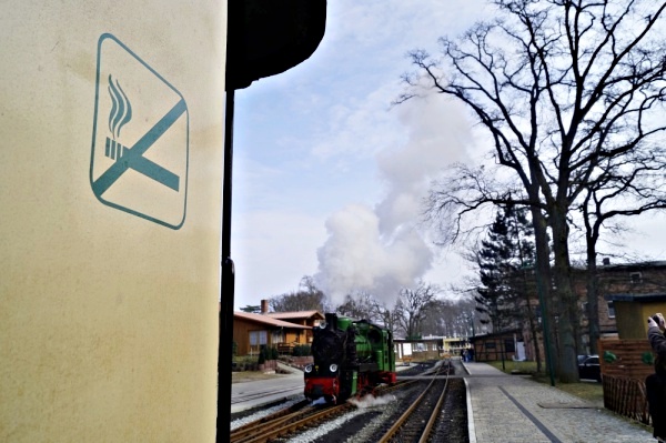 Schon bei meiner Ankunft am Bahnhof von Göhren war mir kleine Fischräucherei gleich nebenan in Auge und Nase gefallen. Jetzt gebe ich den Gelüsten nach - Versuchungen sollte man nachgeben, wer weiß, ob sie wiederkommen - und bestelle mir ein Matjesbrötchen, dazu einen heißen Sanddorn-Punsch (ohne Schuss). Beides genieße ich in einem windgeschützten Strandkorb, während hungrige, neugierige Spatzen zu meinen Füßen nach Bröseln suchend herumspringen. So gestärkt und völlig zufrieden steige ich in die Bahn, nachdem ich noch ein paar Aufnahmen von der Vorbereitung der Dampflok für die Rückfahrt gemacht habe. Mein Vater, ein Eisenbahnliebhaber, wird sich freuen! In den alten Waggons ist es so muckelig warm, dass ich fast eindöse. Das Aussteigen in Binz fällt mir schwer und ich weiß wieder, weshalb ich auch gerne mit dem Bus gefahren wäre: der Kleinbahnhof liegt nämlich ein gutes Stück von der Jugendherberge entfernt, und auf Laufen habe ich gerade mal so gar keine Lust.
