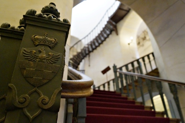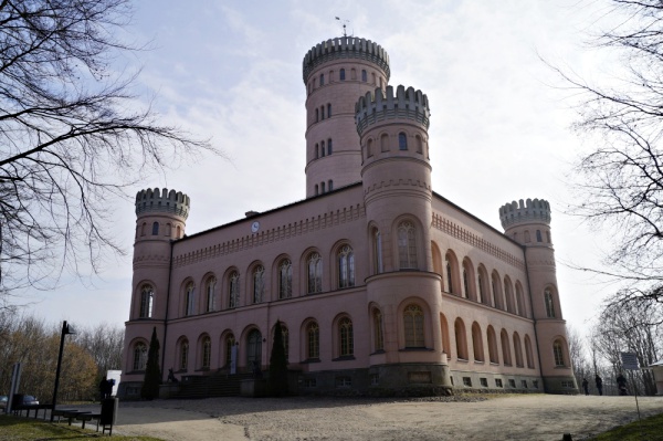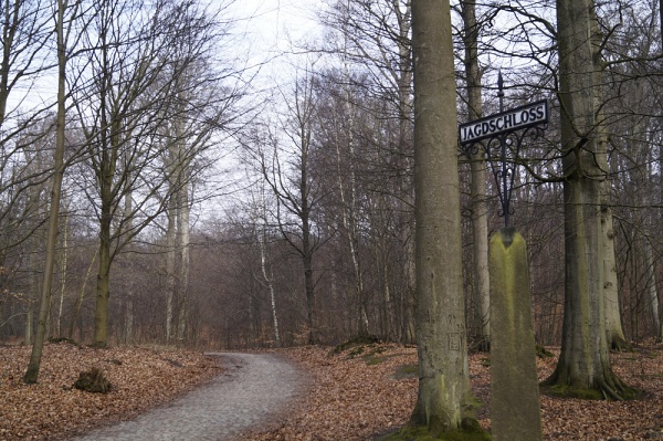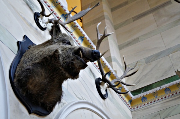 Zuerst aber muss ich mich den Herausforderungen im Wald stellen. Während mir das Gehen auf Asphalt und glatten Wegen nur noch wenig Mühe bereitet, ist schon der holprige Kopfsteinpflasterweg für mich eine kleine Herausforderung. Als es dann auch noch steil bergauf zum 107m hohen Tempelberg geht, auf dem sich das Schloss befindet, schalte ich alle Gedanken an den Rückweg ab. Oben angekommen hole ich erst einmal Luft, bevor ich die Treppen zum und ins Schloss steige. Dort stehe ich mit offenem Mund in der Eingangshalle. Nicht, weil ich nach Atem ringe, sondern weil spätestens hier deutlich wird, dass es sich um ein JAGDschloss handelt. Die Wände der Halle hängen voller Trophäen: Hirsch- und Eberköpfe, Hirsch- und Rehgeweihe. Halali! Kurz darauf werde ich von einem Aufseher in einem generalsmäßigen Befehlston darauf hingewiesen, dass ich meine Stöcke im Schirmständer zu deponieren hätte.