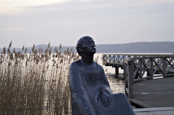 Wenn ich schon hier längs laufe, dann kann ich doch wenigstens noch nach ein paar Fotomotiven Ausschau halten!? Allzu viele finde ich nicht, Eiszeitliches schon gar nicht. Vor allem die Natur ist hier noch sehr weit zurück. Erste Krokusse und vereinzelt Knospen an Hortensiensträuchern lassen sich blicken. Letzte bieten allerdings einen sehr reizvollen Kontrast zu den ebenfalls noch an den Sträuchern vorhandenen, mittlerweile getrockneten Blüten aus dem Vorjahr. Da die Bronzeskulpturen des am See gelegenen Parks der Sinne schon zu sehr im Schatten liegen, schlurfe ich recht elanlos die letzten Meter zur Jugendherberge und beschließe, dass ich mich für heute nicht mehr fortbewege, sobald ich einmal auf meinem Bett sitze. Beine und Füße haben ihr Soll für heute mehr als erfüllt.