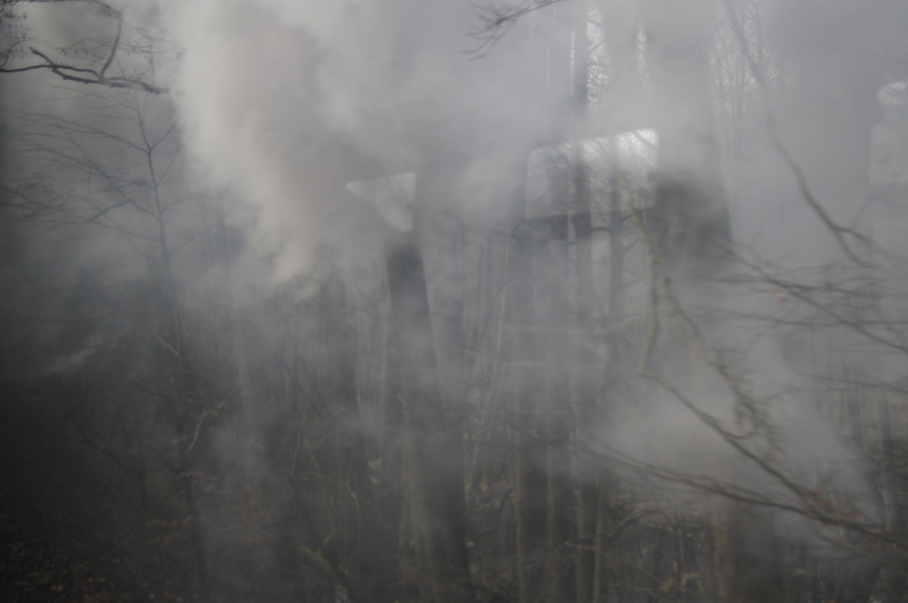 Wie Sie sehen, sehen Sie nichts. Der Rasende Roland im Wald von Granitz in Aktion. |
