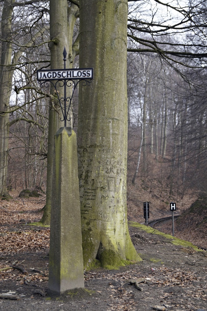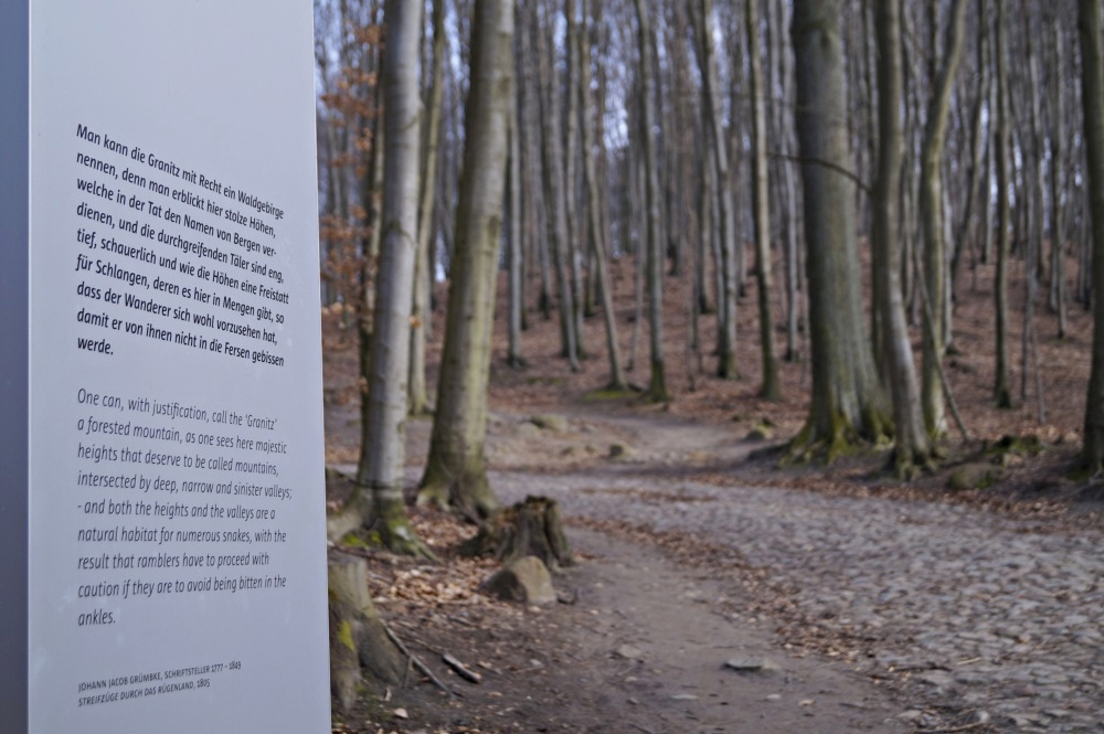 Kurzweiliges im Wald. Immer wieder säumen diese Schilder mit Auszügen aus Reiseführern und/oder -berichten aus dem 19. Jh. den Weg.