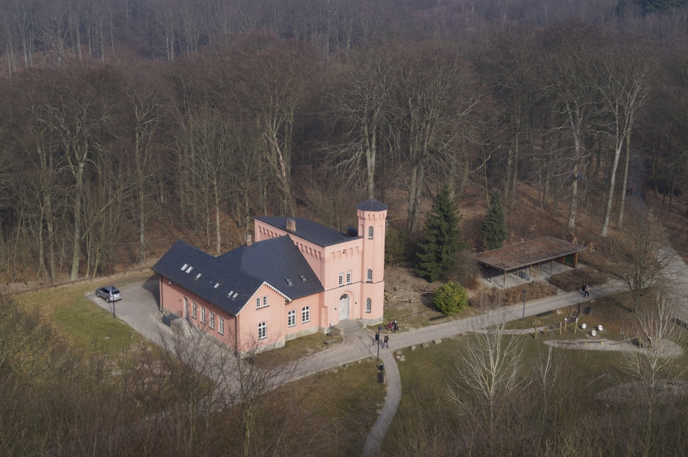 Von der Spitze des Turms hat man - klares Wetter vorausgesetzt - eine wunderschöne 360°-Rundumsicht bis hin nach Usedom. Und auf das dem Jagdschloss Granitz zu Füßen liegende ehemalige Forsthaus. |