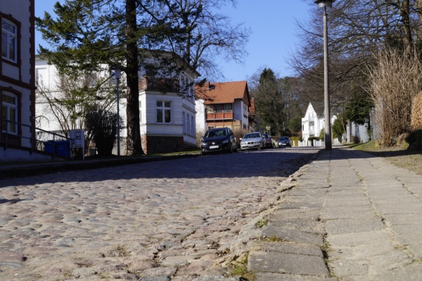 Grobes, unebenes Kopfsteinpflaster und mindestens genauso uneben der Bürgersteig läuten einen steilen Anstieg ein. Wenige Meter weiter säumen hübsche, alte Villen im wilhelmistischen Bäderstil die Straße. Vor vielen steht eine Infotafel, die die Geschichte der Bauten erzählt.