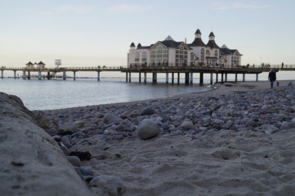 Aber die gefühlten 1000 Stufen hoch zum Hochufer reizen mich nun mal so gaaar nicht, so dass ich - Fahrstuhl sei Dank - doch den direkten Weg hinunter an den Strand nehme. Leider liegt die Seebrücke schon im Schatten. Ich mache schnell ein paar Fotos und schlendere dann noch ein wenig am Strand entlang, "Steine gucken". Gerade bei Sellin liegen schöne Steine in allen Farben und Formen. Ich kann mich an so was nie satt sehen. Natürlich muss ich mich davon irgendwann losreißen und zum Bus zurückgehen. An der Haltestelle treffe ich noch eine Mitbewohnerin der Jugendherberge, die ihren schlafenden, ca. 5-jährigen Sohn auf den Schultern trägt. So gut hätte ich es jetzt auch gerne.