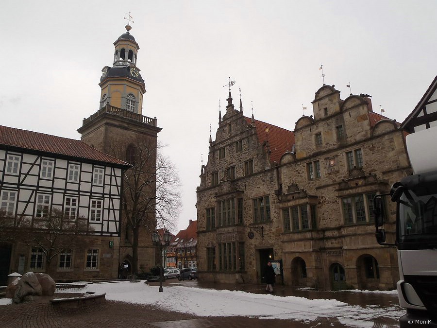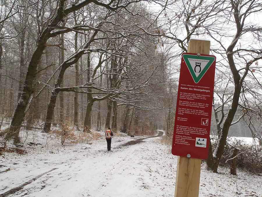 Mein Blick aus dem Fenster fällt auf den Kirchturm der St.-Nikolai-Kirche, den im Aufbau befindlichen Markt und ... Schneeflocken! Schnell schließe ich den Vorhang wieder, das möchte ich jetzt noch nicht sehen! Das Frühstück ist lecker, die Atmosphäre entspannt, und schwupps - zeigt die Uhr dann doch 9h20 an, als wir aufbrechen. Schnell werden noch ein paar Fotos von der Fachwerk-Altstadt in Rinteln geschossen, deren Charme im trüben Wetter leider etwas verloren geht. Bei Lidl decken wir uns mit etwas Proviant für den Tag ein und ziehen dann - im Frühtau zu Berge - gen Weserbergkamm. Puh, die Beine sind schwer, der zweite Tag beginnt wie der erste: empfunden anstrengend! Wir erreichen den Weserbergkamm und schlagen den Weg gen Osten, dem bekannten Zeichen des Weserberglandwegs folgend, ein. Eigentlich wirkt alles in Ordnung, der Weg ist breit und ziemlich eben, auch durch den Schnee lässt es sich gut stapfen.