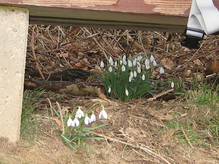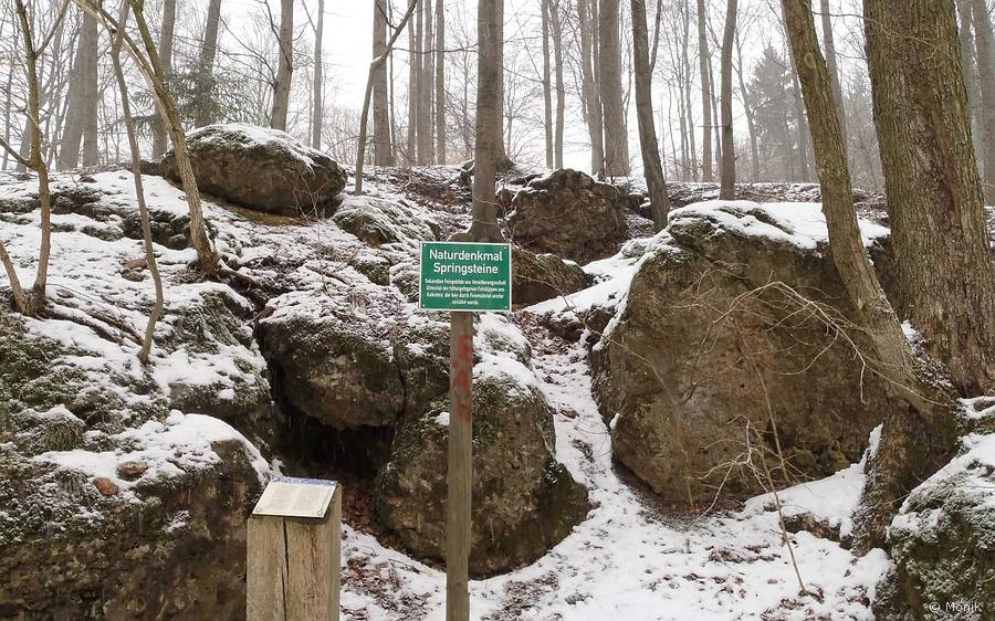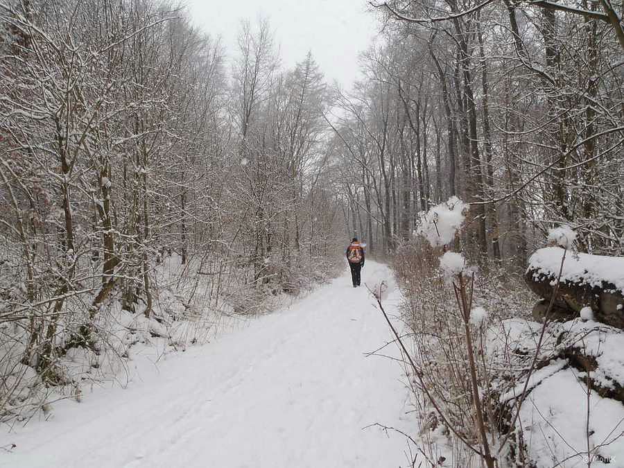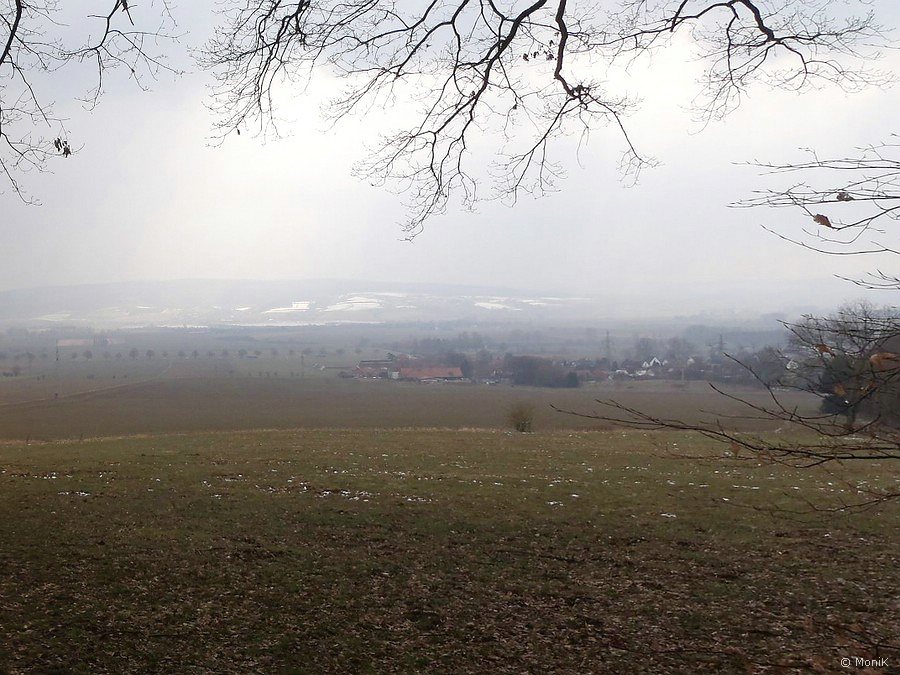 Leider, denn wenn ein Tal durchwandert wird, geht es nach bergab immer wieder bergauf, und so zieht sich der Weg zunächst auf anstrengende Weise hoch in Richtung des 270m hohen Messingberges.Doch wenig später verläuft er dann freundlicherweise am Waldesrand entlang, so dass wir von der schneefreien Strecke aus ausnahmsweise mal dauerhaft einen weiten Blick ins Tal der Weser genießen können. Oberhalb von Westendorf lädt eine Bank in der Sonne zur Rast ein, gleich an einer schönen kurvigen Straße gelegen, die mit dem Motorrad sicher auch nett zu befahren wäre. Ich seufze. Wunschdenken. Immerhin: erste Frühlingsboten zeigen sich in Form von Schneeglöckchen und das Wetter zeigt sich mal ausnahmslos freundlich. In ca. 4km Luftlinie ist sogar die Schaumburg zu erkennen, die noch auf unserer Route liegen soll. Aber man soll den Tag, respektive das Wetter nicht vor dem Abend loben. Als wir weiter wandern, sehen wir in der Ferne schon die nächste Schneeschauer auf uns zukommen, die uns dann, nachdem wir den schweißtreibenden Anstieg zu den unter Naturschutz stehenden Springsteinen geschafft haben, auch einholt.