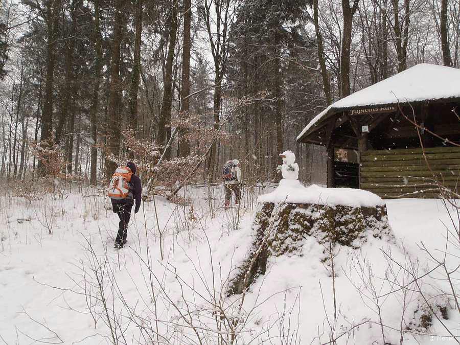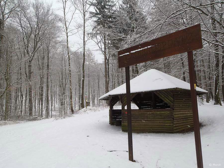 Wenig später wird die Irritation allerdings größer. Eine dicht befahrene Straße ist rechts von uns zu hören. Dem Lärm nach zu urteilen sogar eine sehr dicht befahrene Straße. Ein Blick auf die Karte: südlich vom Wanderweg verläuft eine Bundesstraße, die muss es wohl sein. Dennoch: der Lärm klingt eher nach Autobahn. Autobahn? Kann nicht sein! Die müsste quasi links und dann noch hinter der Bergkuppe liegen. Kann nicht sein! Wir wandern weiter, bis eine Holzhütte an einem Kreuzungspunkt in Sicht kommt. Der Anblick kommt mir irgendwie bekannt vor. Kerstin liest von einem Schild ab: "Das ist der Vorbergsplatz." Wie? Das wäre unser Ausgangspunkt von heute Morgen! Kann nicht sein! Und tatsächlich, wir sind gerade eine Ehrenrunde von schlappen 3km gelaufen! Und das, wo die reine Tagesetappe schon ca. 17km lang ist. Seufz.