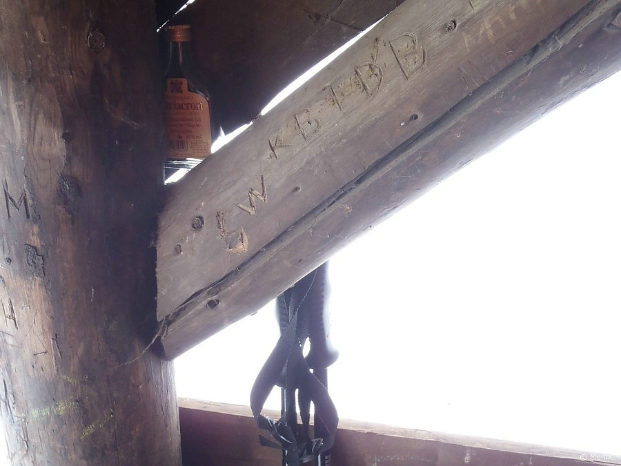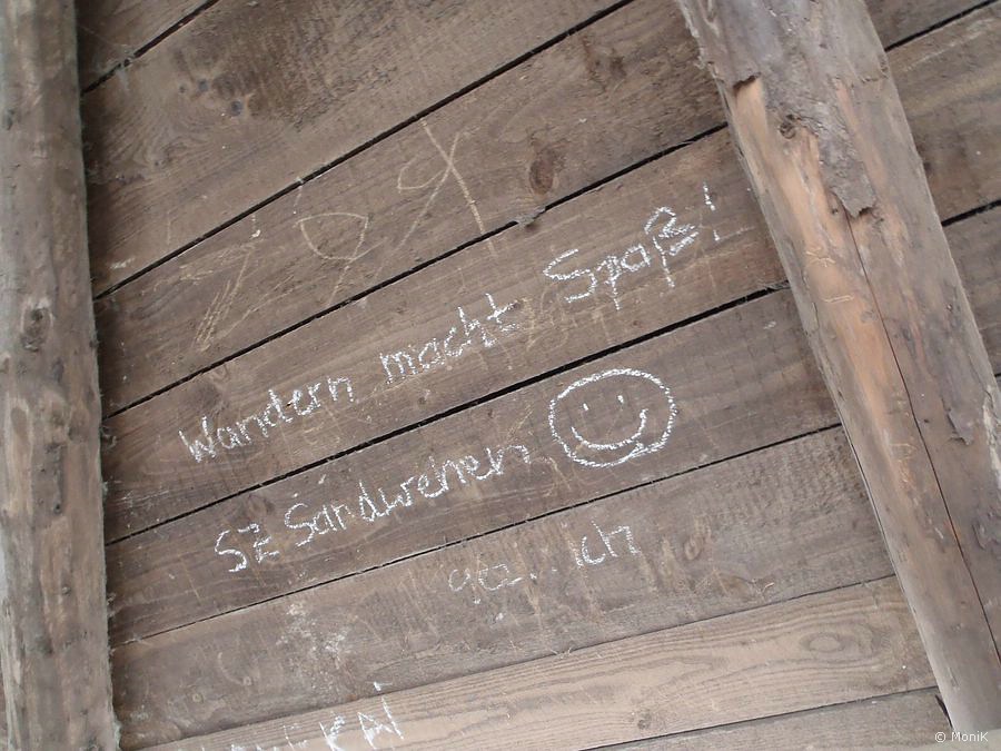 Wir machen in der Hütte eine kleine Rast, sinnieren grummelnd darüber, wie es dazu kommen konnte und erinnern uns: an einer Stelle kreuzte ein schmaler Pfad den breiten Weg, auf dem wir uns befanden.