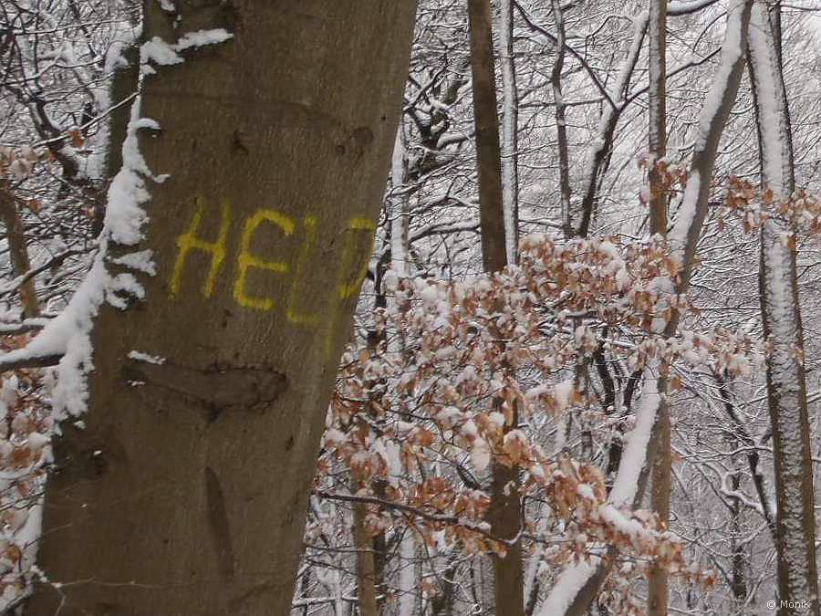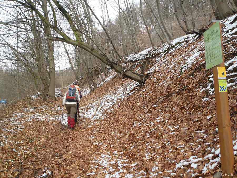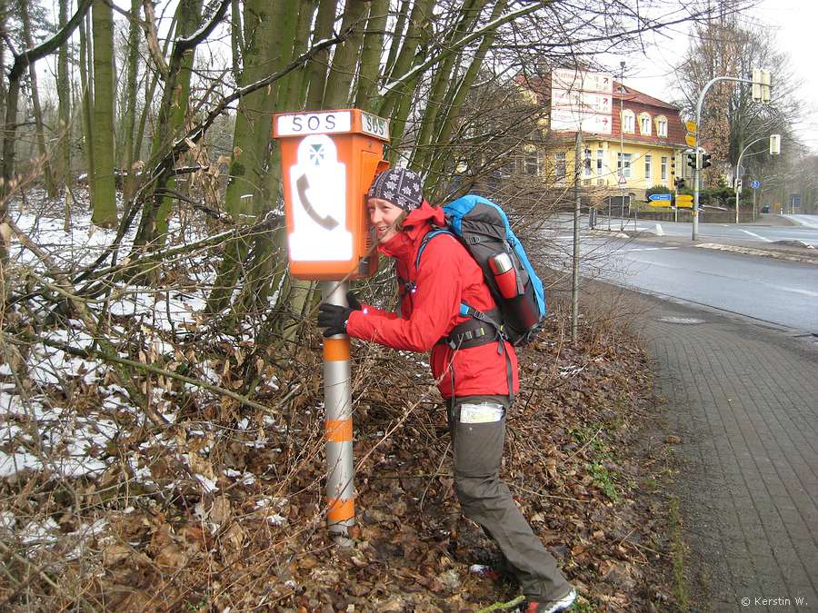Links führte er steil den Berg zu den Luhdener Klippen hinauf, rechts eher ungemütlich-holprig den Berg hinunter. Tatsächlich war hier ein Weserberglandweg-Zeichen angebracht, aber wir waren uns in diesem Moment ziemlich sicher, dass die Strecke nicht bergab führen konnte (und bergauf erst recht nicht, weil wir nicht bergauf wollten). Nun denn, neues Spiel, neues Glück, und so treten wir zunächst wieder in unsere eigenen Fussstapfen, bis wir jenen kleinen Kreuzungspunkt erneut erreichen und seufzend den bei diesen Verhältnissen rutschigen Abstieg in Angriff nehmen. Der Weg führt unterhalb der 250m hohen Hirschkuppe vorbei nach Steinbergen, einer der wenigen Ortschaften, die wir auf der gesamten Tour durchwandern. Ich starte scherzhaft an einer Notrufsäule ein paar Hilferufe, werde aber nicht erhört, sondern von meinen Mitwanderinnen zum Weitergehen überredet.