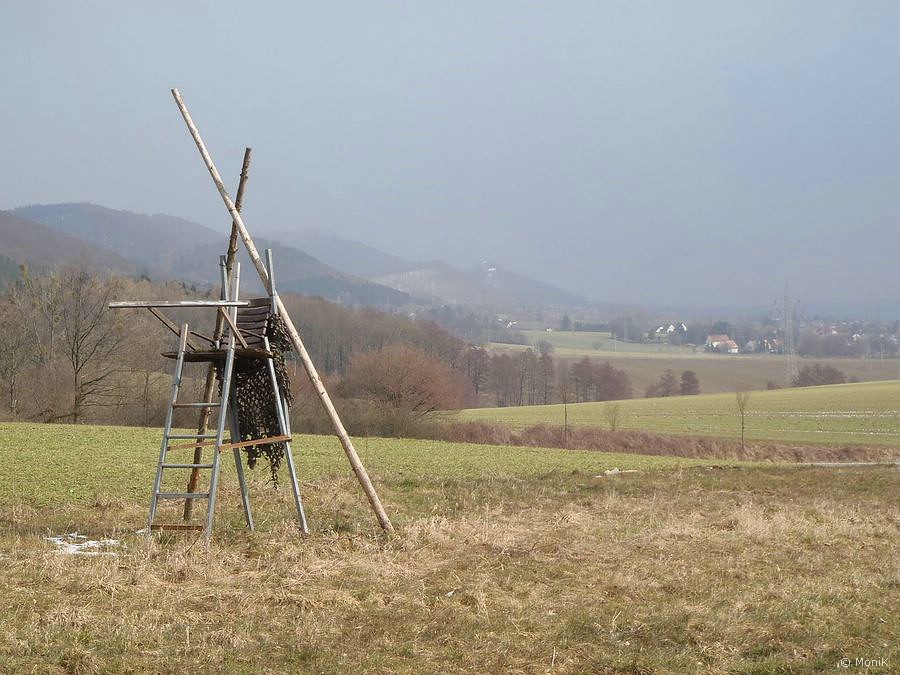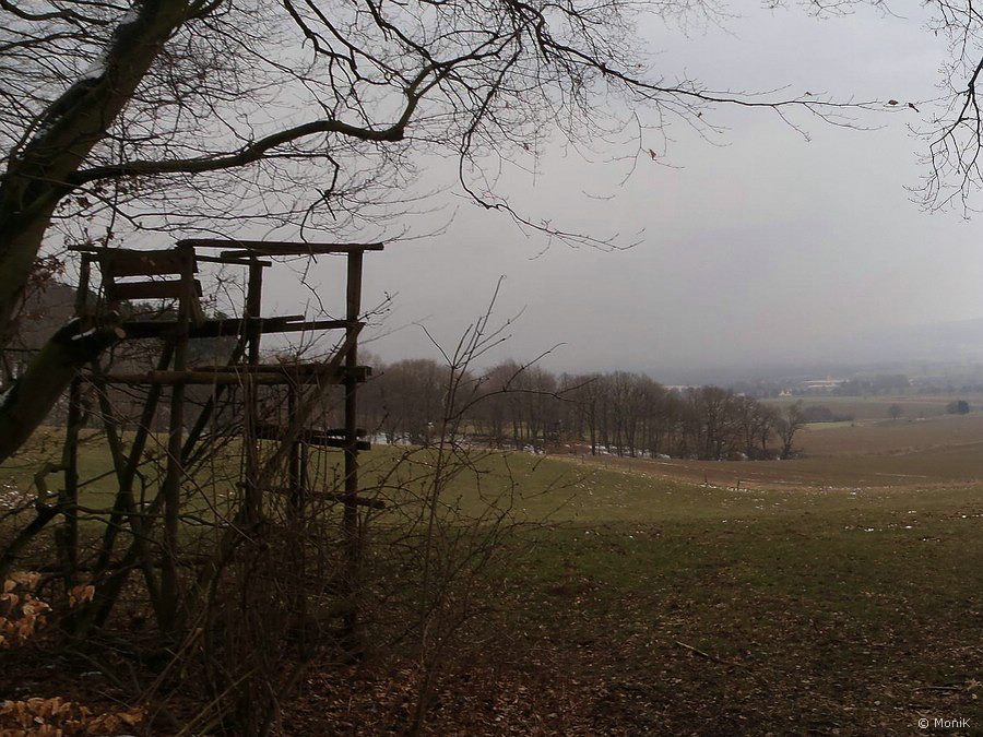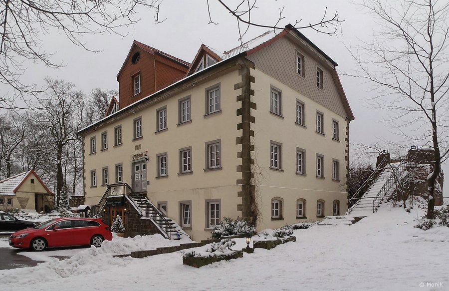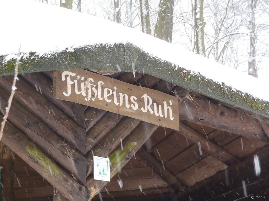 Vom Tal nach oben geschaut vermittelten die Klippen früher, als der Wald noch lichter war den Eindruck, dass sie am Hang regelrecht hervor- springen würden. Daher der Name. Der Blick auf die Karte offenbart uns verschiedene Routenmöglichkeiten, die die Strecke ein wenig verkürzen würden, doch nach den Erfahrungen vom Vormittag halten wir uns lieber an den ausgeschilderten Weg. Der führt steil an der Rasthütte "Füßleins Ruh" vorbei über den 325m hohen Oberberg und den 326m hohen Möncheberg hinauf zur Paschenburg, ein ehemaliges Forst- und Gasthaus im Stil eines kleinen Jagdschlosses. Hier erreichen wir den höchsten Berg des westlichen Wesergebirges oberhalb des Wesertals.