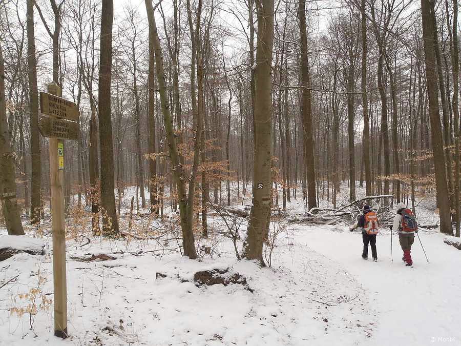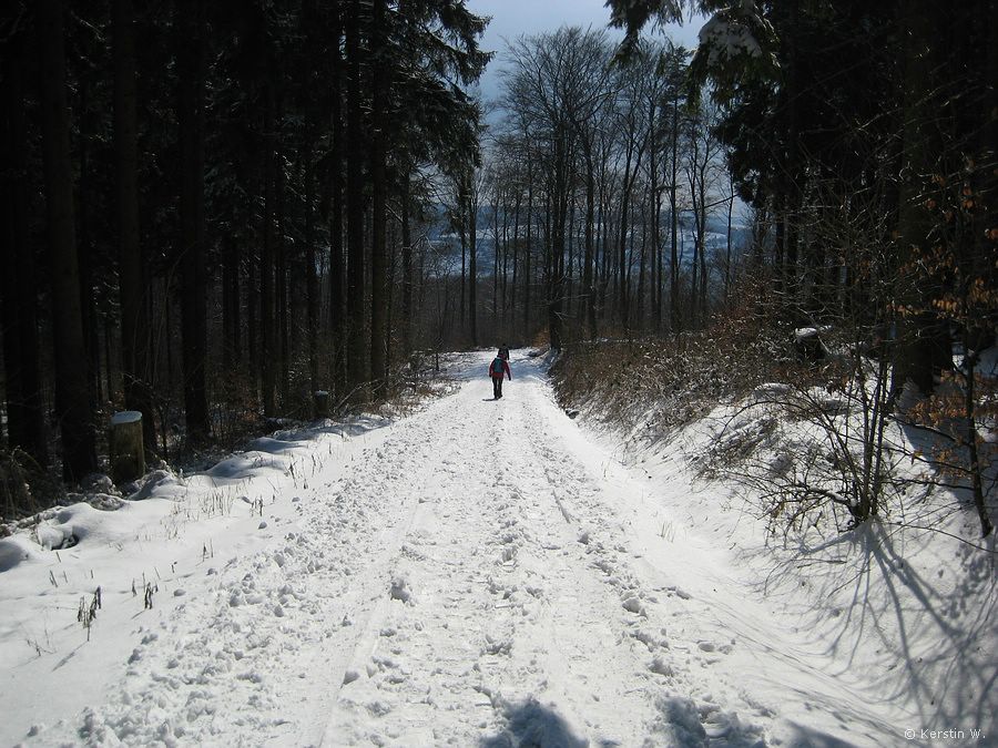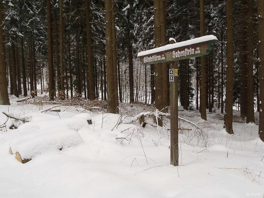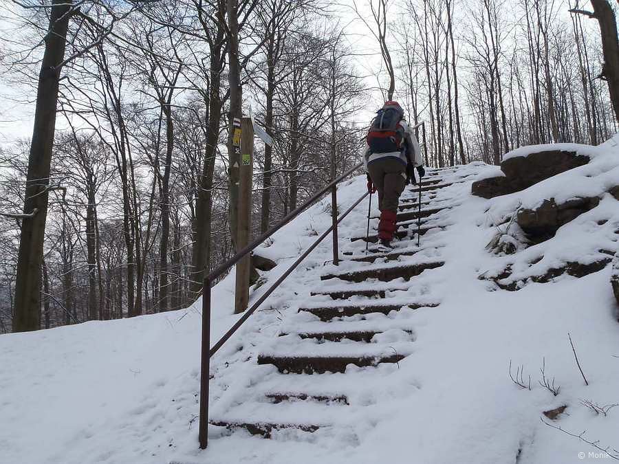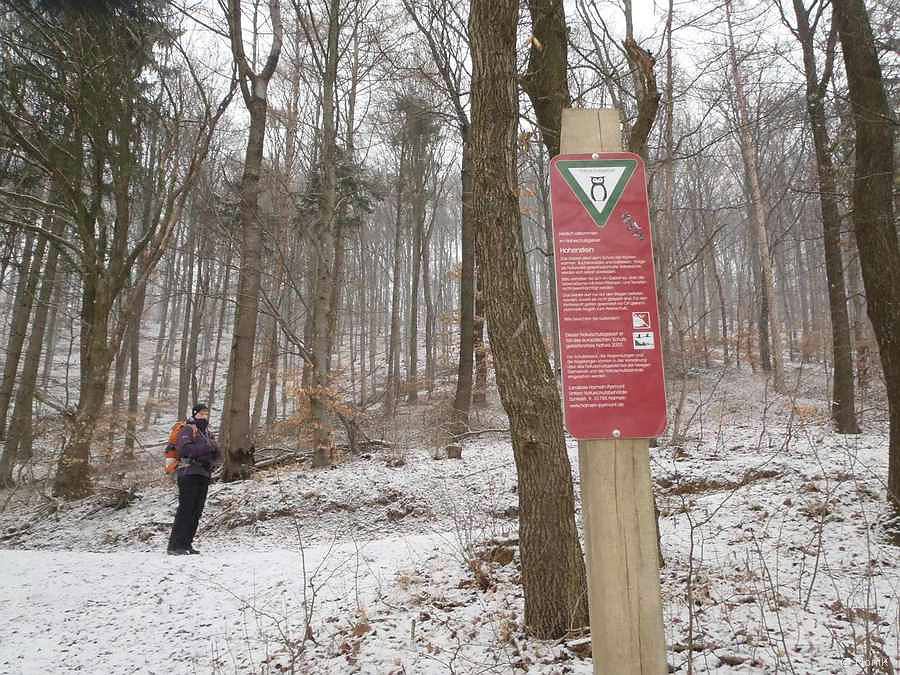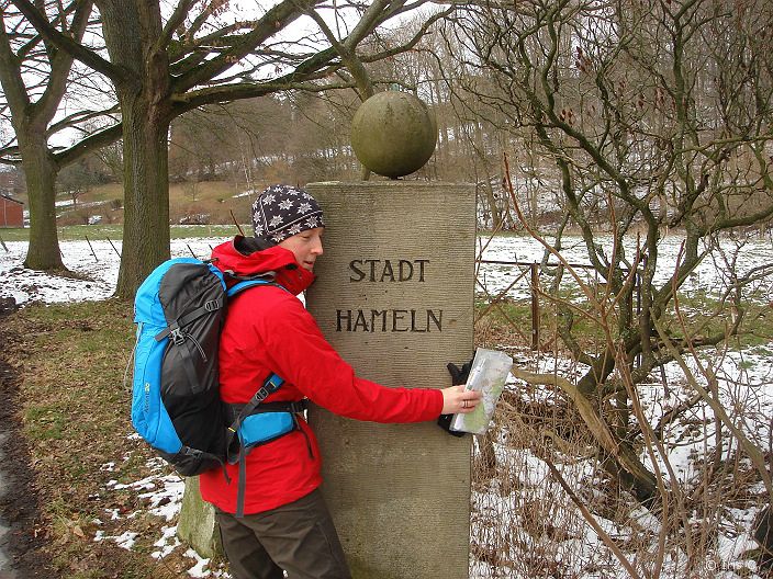 |  Frohe Ostern! Der Osterhase musste sich in diesem Jahr im Weserbergland mit dem Eierfärben bzw. -verstecken keine große Mühe geben. Der morgendliche Blick aus dem Fenster verrät: es schneit mal wieder. Und ausgerechnet heute, wo mit ca. 23km die längste Etappe auf dem Programm steht. Vorausgesetzt, wir verlaufen uns nicht wieder. Meine Beine fühlen sich ähnlich frisch (also gar nicht frisch) wie am Vortag an und ich frage mich, wie ich die Strecke bewältigen werde. Die Frage wird lauter, als wir nach einem guten Frühstück zur fast schon gewohnten Zeit um 9h20 von der Weinschänke Rohdental aufbrechen. Anstatt allerdings den Weg in Richtung 232m hohen Baumengartenberg zu wählen, wie es die Karte anzeigt, entscheiden wir uns für die Variante am unteren Dorfrand und Fuße des genannten Bergs entlang. Die führt uns zunächst über einen Acker, stößt dann aber gottseidank auf den eigentlichen Weserberglandweg, ohne dass wir irgendwelche Zäune und Hecken zu überwinden haben. Mein Blick fällt auf ein Tier mitten auf einem eingezäunten Feld. Ein Schaf? Ganz alleine? Kann nicht sein. Es steht in ca. 50m Entfernung mit dem Rücken zu uns, dreht dann seinen Kopf in unsere Richtung.  Ein Fuchs! Und ein ziemlich großer dazu! Er ist allerdings auf ein Kennenlernen nicht besonders scharf und sprintet - husch, husch - ab ins Gebüsch. Wir kommen gut voran, die Bedingungen sind ok, doch wenig später wird uns der Weg im Wald von einem rot-weißen Absperrband abgeschnitten. "Holzfällung. Betreten verboten. Lebensgefahr." Aha. Aber bestimmt nicht an einem Ostersonntag! Wir ignorieren das Band geflissentlich und fühlen uns später aufgrund der frisch gesägten und bereits sauber gestapelten Baumstämme bestätigt. Wenn doch immer alles so einfach wäre. Kurz darauf stehen wir mal wieder ein wenig orientierungslos an einer Straße. Laut Wanderkarte müssten wir zunächst ein Stück die Straße hinaufgehen, um wenig später rechts in den Wanderweg einzubiegen, der dann parallel zur Straße verlaufen sollte. Wir können von unserer Position aus nichts erkennen, zweifeln entsprechend an der Karte und unserem Orientierungssinn, laufen aber dennoch die Straße hoch, bis wir in einer Art Wendehammer für Waldfahrzeuge oder ähnlich schweres Gerät landen.          Grobe, tiefe Furchen statt ausgeschildertem Wanderweg. Zwar zweigt dort ein Waldweg in die anzustrebende Richtung ab, aber kein Schild ist zu sehen. Was tun? Wir beschließen, dem Waldweg ein Stück zu folgen, der zunächst noch parallel zur Straße verläuft, sich dann aber von ihr entfernt und irgendwie immer unbegehbarer wird. Ein gepflegter, offizieller Wanderweg schaut doch anders aus, oder? Wir verharren zwecks weiterer Überlegungen, als wir am Hang unter uns im Gestrüpp Bewegungen wahrnehmen. Ein kleines Rudel Wildschweine kommt die Böschung hinauf. Ca. 25m hinter uns schießt ein dicker Keiler über den Weg, die Hauer gut sichtbar. Uuuh, mit dem möchten wir widerum keine Bekanntschaft machen. Die anderen Tiere des Rudels bekommen wir nicht mehr zu Gesicht. Entweder verstecken sie sich noch im Gebüsch oder aber haben uns großräumig umlaufen. Wir laufen auch ... und zwar zurück in Richtung Straße, von der wir gekommen sind. Dieser Waldweg ist uns doch wenig suspekt.  Um ein paar Meter zu sparen, suchen wir uns eine Abkürzung den Abhang hinunter. Hier ist eindeutig kein Weg, so dass wir mitunter vor unüberwindbarem Gestrüpp stehen und den ein oder anderen querliegenden Baumstamm zu übersteigen haben. Aber alle Wege führen zum Ziel, und wir befinden uns irgendwann wieder auf der bereits bekannten Straße in Richtung Zersen, wo wir an der nächsten Kreuzung endlich zum ausgeschilderten Wanderweg zurückfinden. Auch hier stehen wir wieder vor der Wahl: nehmen wir die anstrengende Variante über die ca. 300m hohen Moosköpfe oder wandern wir unten durchs Tal zur Baxmannbaude? Da beide Wege als offizieller Weserberglandweg ausgeschildert sind, entscheiden wir uns guten Gewissens für die Talvariante. Die Baxmannbaude, eine kleine Waldschänke, die auch im Winter an Wochenenden bewirtschaftet wird, ist eine Anlaufstelle für Wanderer und Mountainbiker, doch wir haben kein Auge für sie übrig, sondern werfen unseren Blick auf den steilen Anstieg, der sich vor uns aufbaut. Steigung, soweit das Auge reicht. Und Treppen. Von 169m ü.NN. geht es hinauf auf den 340m hohen Hohenstein, auch bekannt als Hohensteiner Klippen, einem Hochplateau mit 50m steil abfallenden Felsklippen.          Wir werden für diese schweißtreibende Anstrengung belohnt, als just oben auf dem Plateau die Sonne durch eine Wolkenlücke bricht und wir einen beeindruckenden Weitblick über das Wesertal erhalten. Wir verschnaufen an diesem Felsenriff, an dem schon Germanen, Cherusker und Sachsen ihre Götter verehrten. Dass die Germanen hier einst ihrer Frühlingsgöttin Ostara huldigten, weiß ich da noch nicht. Hätte ich angesichts der Schneemassen auch nicht geglaubt. Und prompt als wir unsere Wanderung fortsetzen, fallen wieder ein paar Schneeflocken. Unglaublich. Immerhin: der Osterhase war auch schon da, wie uns ein Schneemodell vor einer nahegelegenen Rasthütte beweist. Das macht den Weg bis ans Ziel aber auch nicht kürzer: noch über 15km bis nach Hameln. Und die höchste Erhebung, der 440m hohe Süntel, liegt noch vor uns. Eine ganze Weile wandern wir über den Weserbergkamm, haben zwar kaum Höhenmeter zu überwinden, stapfen allerdings durch hohen Schnee, was das Wandern nicht weniger anstrengend macht.  Wir begegnen jedoch mehr Menschen als in den Tagen zuvor - Familienosterspaziergänge scheinen hier noch ein Brauch zu sein, der gepflegt wird. "Süntelturm 20min." - das Schild macht Hoffnung, denn mit der höchsten Erhebung der Hohen Egge auf 440m ü.NN. erreichen wir den höchsten Punkt unserer gesamten Tour und wähnen uns dem Zielort Hameln bereits sehr nah. Aber erst einmal muss der Süntelturm, ein um 1900 erbauter, schlanker, ste