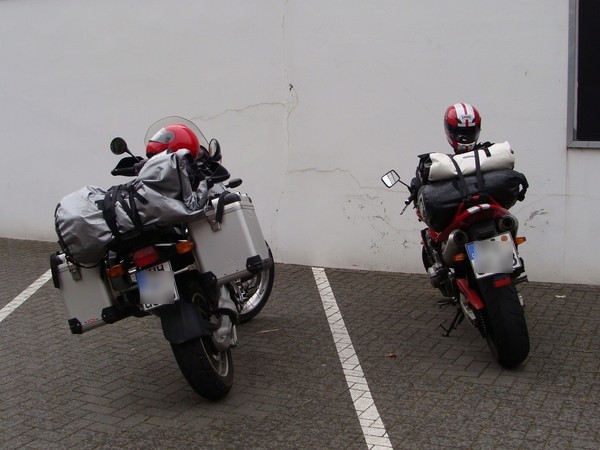 Und so ist es dann auch. Wir lachen beide laut, als wir uns an der Raststätte "Hasselhöhe" an der A7 südlich von Hamburg treffen und unsere beiden Motorräder vergleichen. Zu Kerstins Verteidigung muss ich sagen: ihr Zeltgestänge ist so lang, dass es nicht in die Koffer passt und deshalb in einer (allerdings riesigen) Packrolle hinten quer über das Motorrad geschnallt war. Ach, herrlich, noch keinen Kilometer gemeinsam gefahren und schon wieder so am Lachen! Dann geht's endlich los. Wir fahren nur wenige Kilometer über die A7 in Richtung Süden und verlassen sie dann bei Soltau, nicht ohne einen stummen Gruss an Iris zu senden, die hier in der Nähe wohnt, aufgrund eines Kreuzbandabrisses aber leider völlig außer Gefecht gesetzt ist.