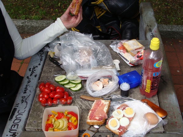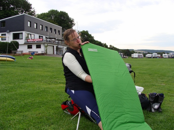Ok, ok, es ist kein Luxuspavillon - zwei große Alukisten wie Kerstin sie hat, bekäme ich wohl nicht in meinem Zelt unter. Sie dagegen in ihrem Zelt schon. Aber mein Ziel ist ja auch "Wochenendtour". Ich bin begeistert vom schnellen Aufbau, das ermutigt doch für weitere Touren. Weil wir dann doch ein bisschen länger herumtrödeln, bekommen wir in der vereinseigenen Gaststätte fast kein Abendessen mehr. Wir nehmen, was wir kriegen, in diesem Falle eine ordentliche Portion Bratkartoffeln mit Spiegeleiern, die trotz der Schlichtheit unglaublich lecker schmeckt. Herz, was begehrst du mehr? Es folgt die nächste mit Spannung erwartete Phase: die Nacht. Wie werde ich auf der Isomatte schlafen? Wie werde ich mich im Schlafsack fühlen? Wird mir warm oder kalt sein? Wie werde ich mit der Geräuschkulisse klarkommen? Ich hoffe, diese Fragen werden mir in der Nacht kein Kopfzerbrechen bereiten, sondern einen halbwegs erholsamen Schlaf bescheren. |