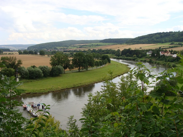 Von hier oben hat man einen wunderschönen Blick auf die Weser bzw. eine Weserschleife. Zu Füßen der Burg quert eine der zahlreichen Weserfähren vom einen zum anderen Ufer.