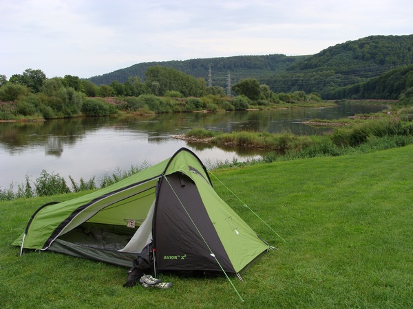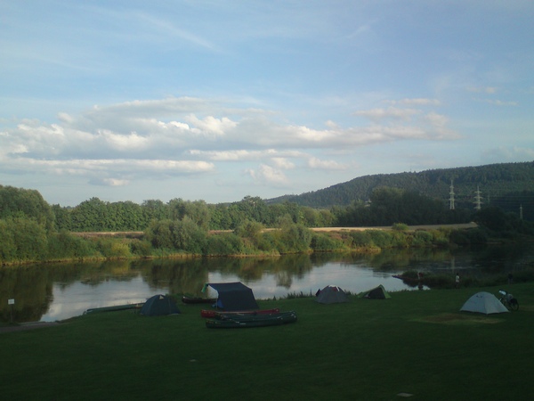 Wir lassen uns ein wenig treiben und wählen anschließend, weil wir keinen Zeitdruck verspüren, nicht den direkten Weg an der Weser längs nach Beverungen, sondern bauen ab Albaxen eine schöne Berg-und-Talfahrt in die Route ein, die uns über Bödexen, Fürstenau, Eilversen, Overhausen und Bosseborn hinunter nach Ottbergen führt. Hier, zwischen Bosseborn-Ottbergen-Höxter, wurde früher der legendäre Weser-Bergpreis, ein Bergrennen, ausgetragen. Hmmjaaa, die Strecke macht - egal ob bergauf oder bergab - Laune! :-) Weniger Laune macht wenig später das Wetter. Fast hätten wir es trocken bis nach Beverungen geschafft, aber ca. 10km vor unserem Ziel erwischt uns doch noch eine ordentliche Husche von oben, so dass wir uns erst einmal unterstellen, bevor wir dann durch das schöne Roggenthal den Endspurt zum Bootshaus Beverungen in Angriff nehmen. Auf dem Zeltplatz ist es erfreulich leer, doch bevor wir das Gepäck abrödeln und für unsere Zelte einen schönen Platz in Ufernähe suchen, trinken wir erst einmal ein obligatorisches "Zisch!" und genießen die Aussicht von der Terrasse des Bootshauses auf die Weser und Umgebung.