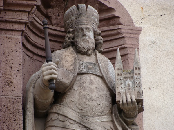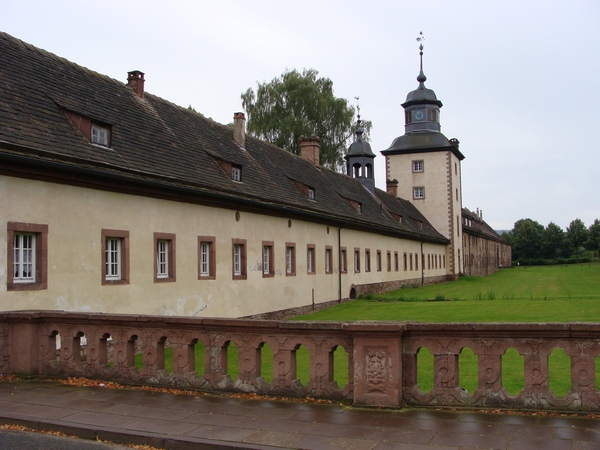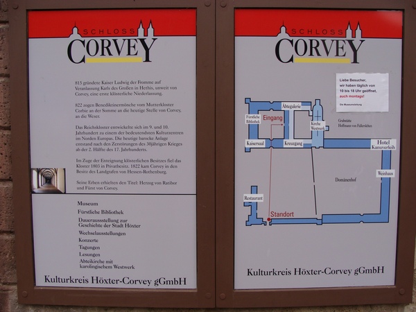 Wir stellen die Motorräder vor dem auch sonntags geöffneten Verkaufsraum der Manufaktur ab und besichtigen zunächst einmal von außen das im Stil der Weserrenaissance erbaute Schloss und die umliegenden Gebäude. Vom hoch über der Weser thronenden Schloss, das heute das Museum der Manufaktur beherbergt, hat man eine hübsche Aussicht. Leider auch auf das schlechte Wetter, das in Form von Regen einsetzt. Wir flüchten uns zunächst in den Verkaufsraum der Manufaktur und versuchen, den durch die Preise der dort ausgestellten Ware ausgelösten Hustenreiz zu unterdrücken. Naja, gucken kost ja nix. Ist ja auch kein Campinggeschirr, das dort zum Verkauf angeboten wird, sagen wir uns. Wenig später setzen wir unsere Fahrt zum Kloster Corvey fort. Die Hochzeitsgesellschaft vom Vortag ist verschwunden, das schöne Licht leider auch, denn der Himmel zeigt sich nach wie vor von seiner grauen Seite. Wir schlendern dennoch über das Gelände der ehemaligen Benediktinerabtei, die einst zu den bedeutendsten karolingischen Klöstern zählte und heute ein Schloss ist.