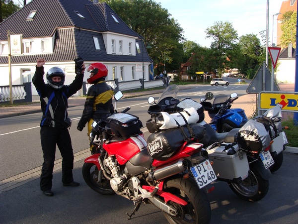 Gut gelaunt geht es anschließend auf den letzten kurven- und waldreichen Kilometern weiter über Eldagsen und Pattensen, kurz vor der A7. Ein Blick auf die Uhr, ein Blick zu Kerstin: "Wir könnten um die Kaffeezeit bei Iris sein." Ein Grinsen. Ein Anruf bei Iris: "Was machst Du heute noch?" Und der Überfall geht klar. Ab Laatzen fahren wir auf die A7, lassen Hannover zügig hinter uns und sind ca. 1 Stunde später bei Iris in der Nähe von Walsrode, die sich wie Bolle freut, dass wir vorbeischauen. Bei lecker Kaffee & Kuchen wird ausgiebig gelacht und geklönt, und als wir zum letzten Streckenabschnitt aufbrechen, sind wir endlich wieder zu dritt unterwegs. :-) Iris beschließt, uns ein Stück zu begleiten. Sie will gleichzeitig testen, wie weit ihr Knie diese Belastung schon mitmacht. Aber erst einmal ist es nicht das Knie, sondern ihre KLE, die den Dienst verweigert. Na gut, muss halt die Fazer her, auch wenn der Kniewinkel hier unangenehmer ist. Ist das ein schöner Anblick, als Iris vorneweg den Tourguide macht. Ich bin mir sicher, dass jede von uns ein breites Grinsen im Gesicht hat.
