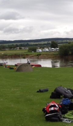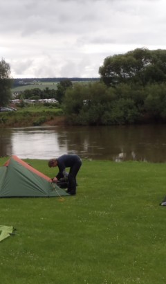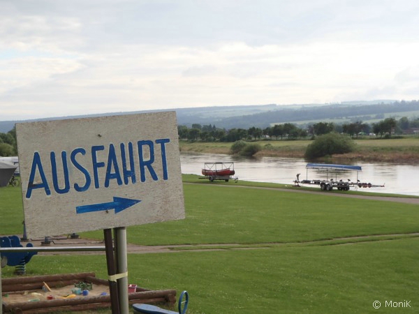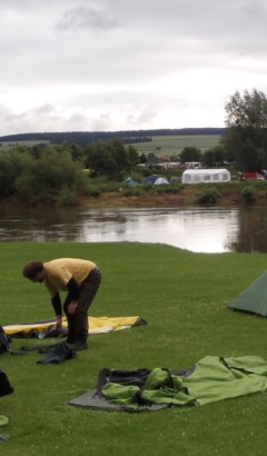 Wir tauschen die Reihenfolge: erst werden die Zelte aufgebaut, dann folgt unser "Zisch!", alleine schon um sicher zu sein, dass wir auch noch ein Abendessen bekommen. Frau lernt schließlich aus Erfahrungen. Mit Spannung verfolgen wir Iris' Zeltaufbau. Dieses Mal ist es ihr Zelteinweihungswochenende. Sie hat sich eine "Hundehütte" gekauft - viel anders kann man das Zelt in dieser Größe nicht bezeichnen - und der Unterschied zu Kerstins und Heikos Zelt löst dann auch erste spöttische Bemerkungen aus. Zu wessen Gunsten sei dahin gestellt. Wenig später sitzen wir auf der Terrasse des Bootshauses, genießen Aussicht und Ruhe und entspannen bei Getränk und Essen. Dieser Platz strahlt eine unglaubliche Ruhe aus. Äh, ja, Ruhe ... solange manN noch nicht im Zelt liegt und zu schnarchen beginnt. Spätestens hier vermisst frau einen Komfort der Unterkunft mit einem festen Dach über dem Kopf: schallisolierte Zimmerwände! Nun denn ... Gute Nacht, John Boy!